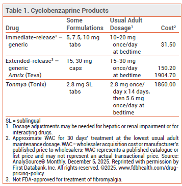 CONCLUSION — The sublingual formulation of cyclobenzaprine (Tonmya) can modestly reduce pain intensity and improve sleep quality in patients with fibromyalgia. Direct comparisons with less expensive oral cyclobenzaprine formulations or other drugs used for this indication are lacking.