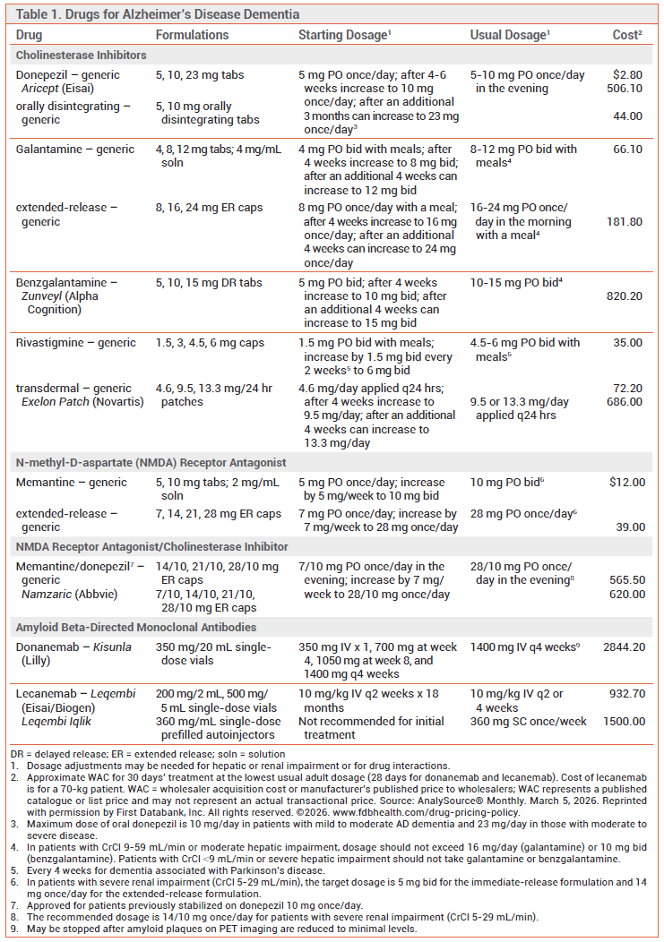 The IV amyloid beta-directed monoclonal antibodies donanemab (Kisunla) and lecanemab (Leqembi, Leqembi Iqlik) are FDA-approved for treatment of AD; they should only be initiated in patients with MCI or mild dementia after confirmation of brain amyloid pathology.33,34 No data are available on their safety or efficacy for moderate or severe AD dementia. Both drugs reduce amyloid beta plaques in the brain and modestly slow cognitive decline, but neither drug has been shown to stop or reverse cognitive decline or the underlying neurodegenerative processes. The amyloid beta-directed monoclonal antibody aducanumab (Aduhelm) was withdrawn from the market in 2024 for commercial reasons.