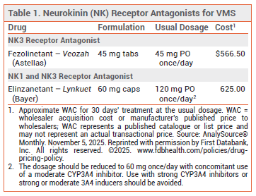 Elinzanetant (Lynkuet – Bayer), a first-in-class neurokinin 1 (NK1) and neurokinin 3 (NK3) receptor antagonist, has been approved by the FDA for treatment of moderate to severe vasomotor symptoms (VMS) due to menopause. Fezolinetant (Veozah), an NK3 receptor antagonist, was approved for the same indication in 2023.1