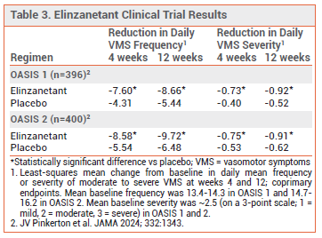 CLINICAL STUDIES ― FDA approval of elinzanetant was based on the results of two double-blind trials (OASIS 1 and 2) in a total of 796 postmenopausal women (mean age 54.4-54.8 years) who were experiencing ≥50 moderate to severe hot flashes per week. Patients were randomized to elinzanetant 120 mg once daily for 26 weeks or placebo for 12 weeks followed by elinzanetant for 14 weeks. In both trials, elinzanetant significantly reduced the daily frequency and severity of VMS at weeks 4 and 12, the primary endpoints, compared to placebo (see Table 3). It also significantly improved sleep disturbances and menopause-related quality of life compared to placebo at week 12.4