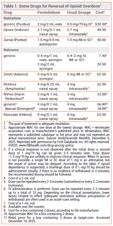 CONCLUSION — Zurnai, an autoinjector formulation of the opioid antagonist nalmefene, is now available by prescription for intramuscular or subcutaneous administration to reverse opioid overdose. Nalmefene has a longer duration of action than many opioid analgesics, which could precipitate a prolonged period of withdrawal in patients who are physically dependent on opioids. Naloxone, which is shorter-acting and available for sale over the counter as a nasal spray (Narcan, and others), may be a safer choice.