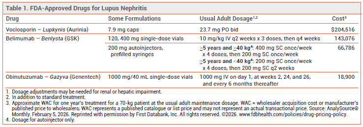 CONCLUSION ― Addition of the IV CD20-directed monoclonal antibody obinutuzumab (Gazyva) to standard treatment improved renal response rates in patients with active proliferative lupus nephritis. Obinutuzumab has not been directly compared with other drugs approved for this indication, but the interval between maintenance doses is much longer with obinutuzumab (6 months) than with voclosporin (Lupkynis) or belimumab (Benlysta).