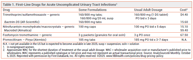 STANDARD TREATMENT — Preferred drugs for first-line empiric treatment of uUTIs in nonpregnant women include trimethoprim/sulfamethoxazole, nitrofurantoin, fosfomycin, and pivmecillinam.2-4 Amoxicillin/clavulanate, cefpodoxime, and cefadroxil are second-line options. The fluoroquinolones ciprofloxacin and levofloxacin are alternatives for patients who cannot take a beta-lactam antibacterial drug. Increasing resistance of common uropathogens to all of these drugs is a concern.